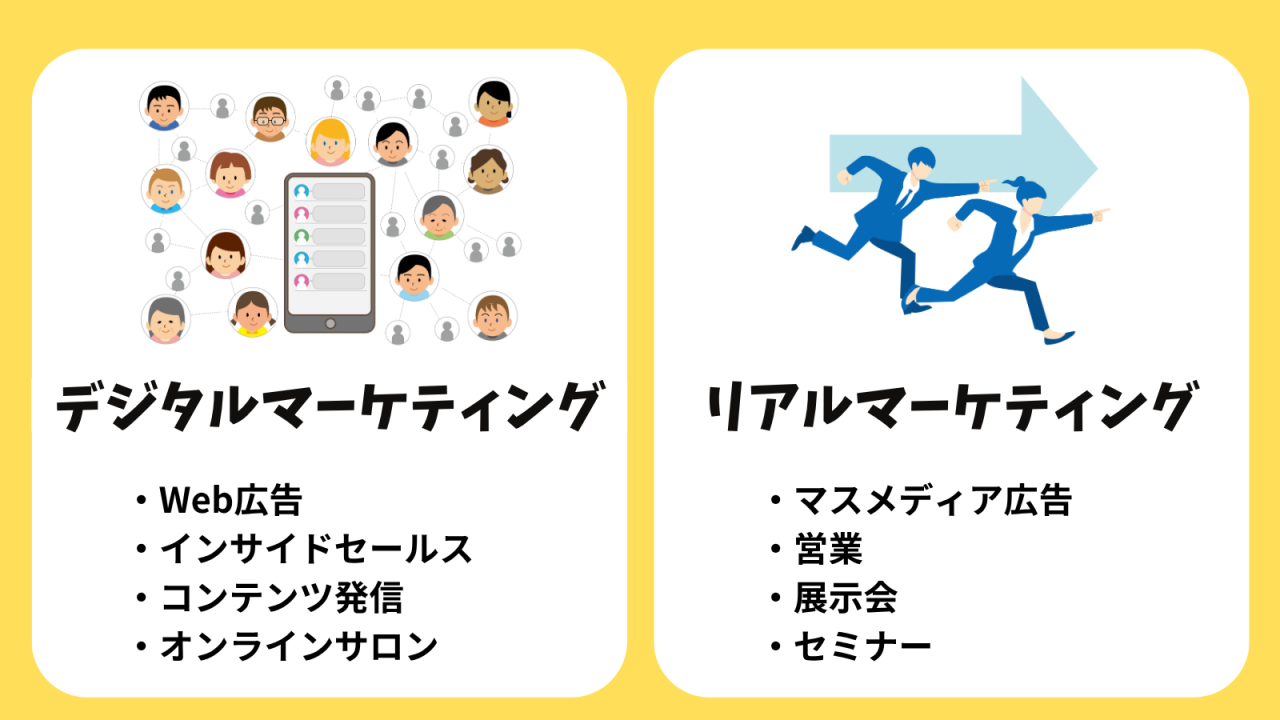 マーケティングの主な種類は「デジタルマーケティング」と「リアルマーケティング」に分かれます。本題であるWebマーケティングは、このデジタルマーケティングの部類に属します。
